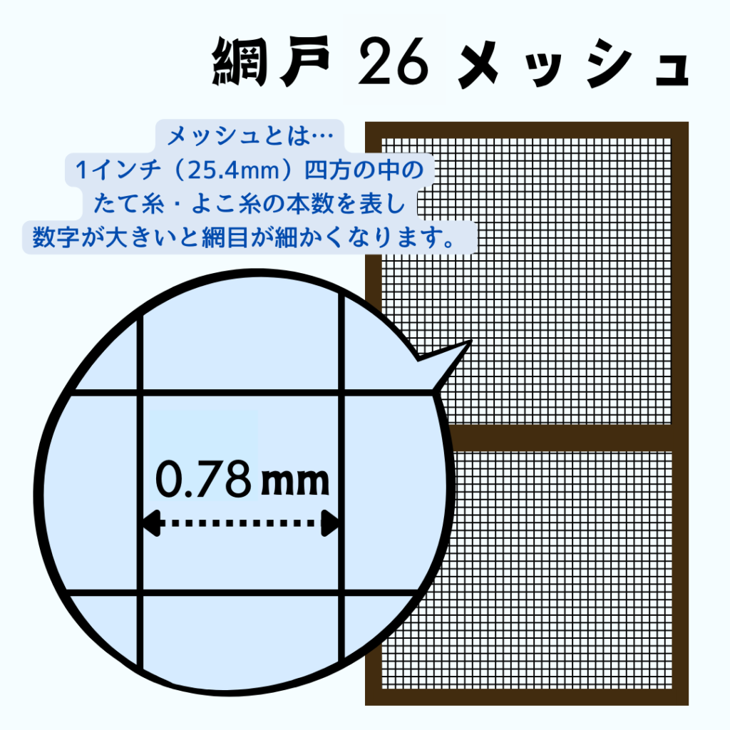| 特徴 | 最も一般的な網の素材(ポリプロピレン)です。 メッシュ数の数字が大きければ大きいほど、網の目は細かくなり、小さなコバエなどの侵入を防ぐことができます。 |